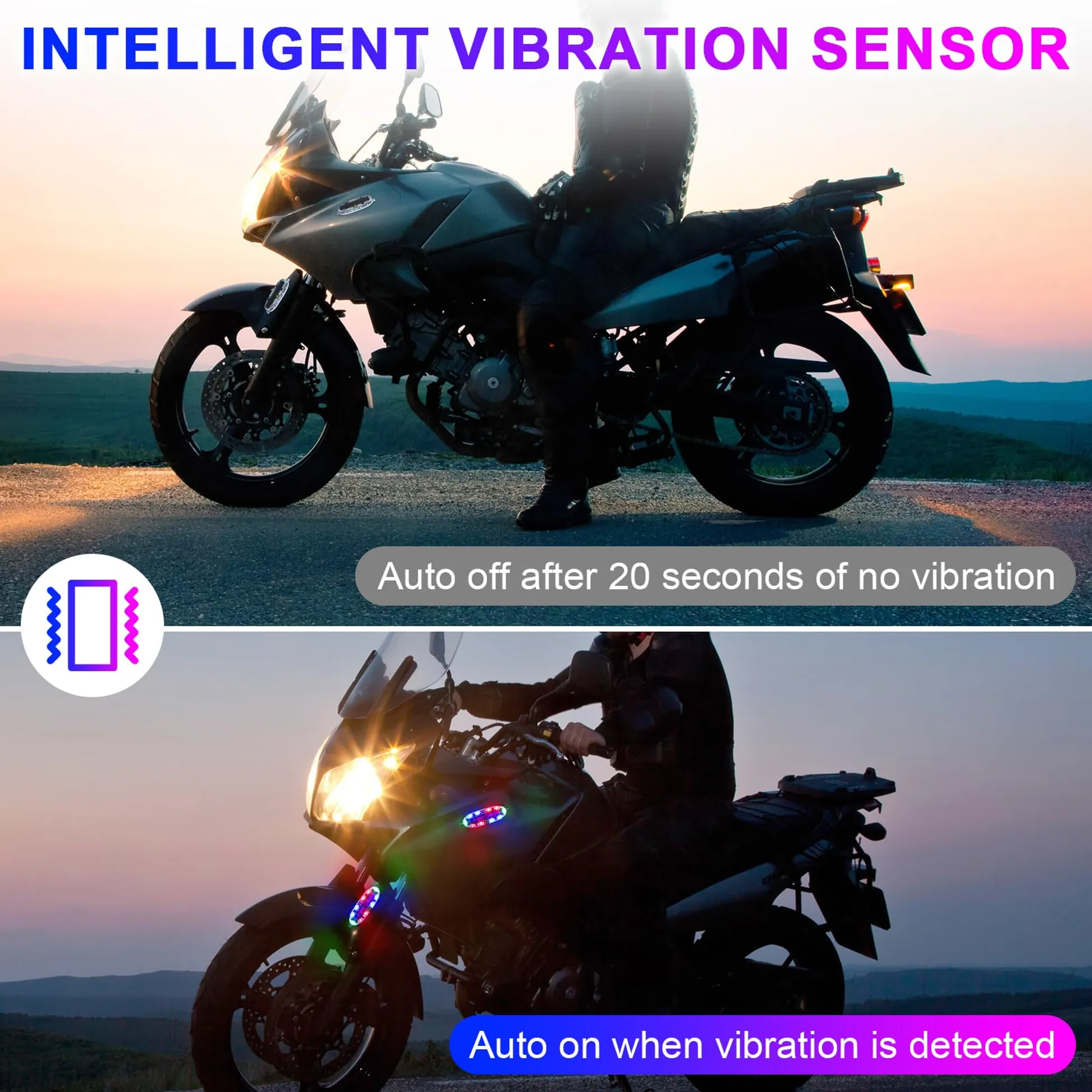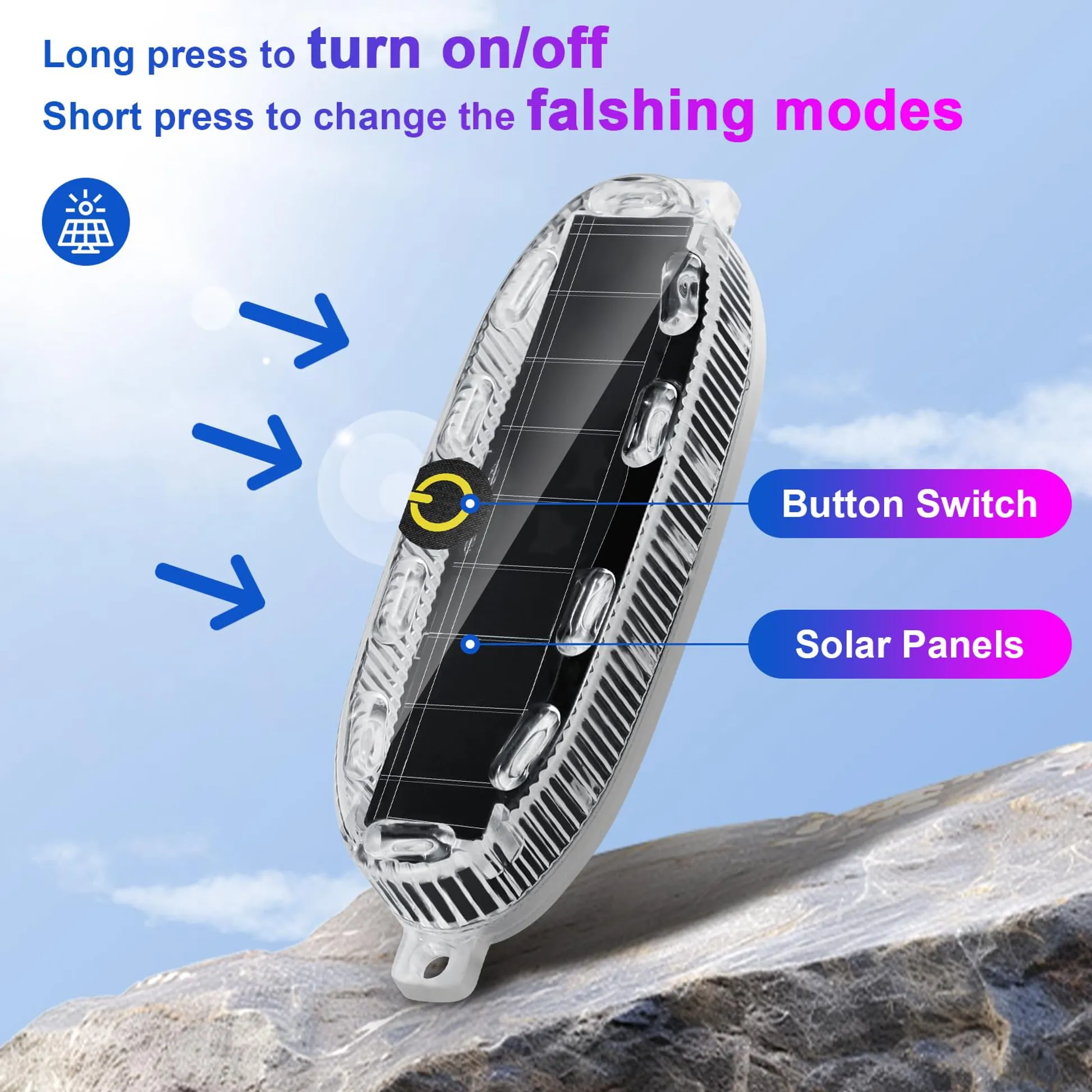 • Easily Operation: Easily operate the solar strobe light with a long press of the power button for 3 seconds to turn it on or off, and a short press to cycle through the 3 flashing patterns.If no vibration is detected for 20 seconds,the strobe light enters standby mode.It will auto on when vibration is detected(Vibration Mode).