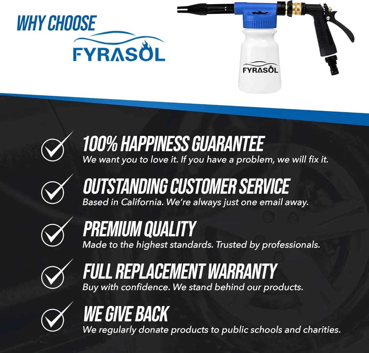 - CAR PRO’S SECRET: Every car professional knows that using a car wash foam helps to carry dirt particles and grime gently away from paint or chrome surfaces, avoiding harmful scratching. The FYRASOL Foam Washing Gun turns any car wash into a foaming bubble party keeping your paintwork and chrome bling intact.
